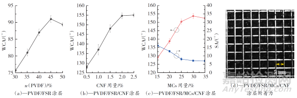 Fig.2 Influence of addition amount of PVDF,CNF and MCs on wettability of coating,adhesion of PVDF/FSR/MCs/CNF coating