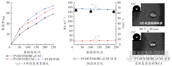 圖3 摩擦過程中各涂層的質(zhì)量損失和潤濕性變化以及PVDF/FSR/MCs/CNF涂層自修復(fù)性