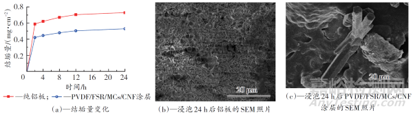 圖4 樣品表面結(jié)垢量變化,浸泡24 h后鋁板和PVDF/FSR/MCs/CNF涂層的SEM照片