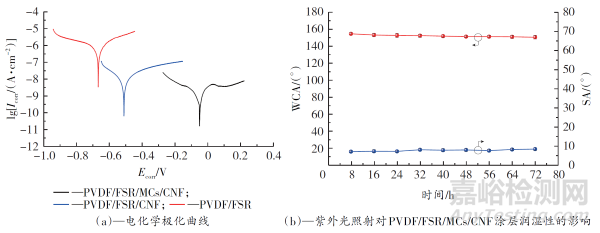樣品電化學(xué)極化曲線和紫外老化試驗中PVDF/FSR/MCs/CNF涂層表面潤濕性變化見圖5。