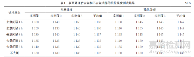 試樣經(jīng)過(guò)發(fā)黑和磷化表面處理,放置時(shí)間分別為1,2,3,4,5h,在相同的去氫條件下對(duì)試樣進(jìn)行去氫處理,去氫溫度為190℃,去氫時(shí)間為3h。另加工一組不去氫處理的試樣,共計(jì)6組。