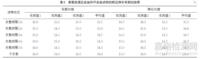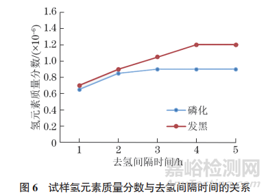 (5)經(jīng)發(fā)黑和磷化表面處理后,隨著去氫間隔時(shí)間的延長(zhǎng),材料的氫元素質(zhì)量分?jǐn)?shù)均呈升高趨勢(shì)。