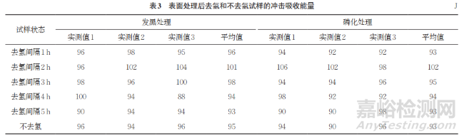 (2)經(jīng)發(fā)黑和磷化表面處理后,隨著去氫間隔時(shí)間的延長(zhǎng),材料的沖擊吸收能量呈先升高后降低的趨勢(shì),去氫間隔2h試樣的沖擊吸收能量最高。