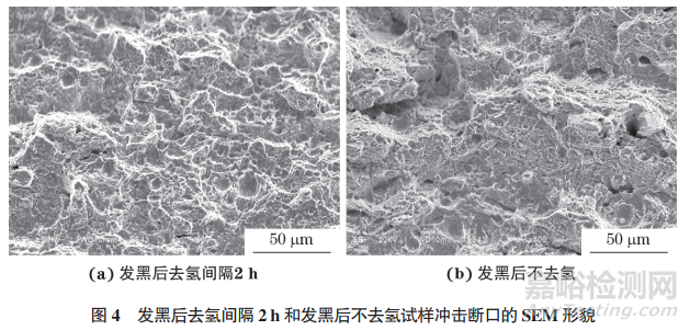 發(fā)黑后去氫間隔2h和發(fā)黑后不去氫試樣沖擊斷口的SEM形貌如圖4所示。由圖4可知:去氫試樣斷口的韌窩分布均勻,呈韌性斷裂特征;不去氫試樣的斷口韌窩分布不均,呈準(zhǔn)解理斷裂特征。