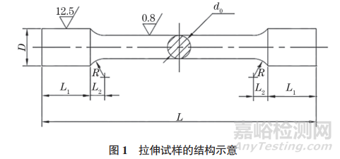 試驗(yàn)材料為42CrMo合金鋼,熱處理方式為淬火回火,硬度為353~381HB。拉伸試樣的結(jié)構(gòu)如圖1所示。沖擊試樣的尺寸(長(zhǎng)度× 寬度× 高度)為10mm ×10mm ×55mm,U型缺口,深度為2mm,底部曲率半徑為1mm。圓柱形試樣的直徑為20mm,高度為20mm。
