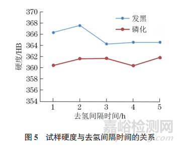 (4)經(jīng)發(fā)黑和磷化表面處理后,隨著去氫間隔時(shí)間的延長(zhǎng),材料的硬度變化小于5HB,去氫間隔時(shí)間對(duì)材料硬度的影響較??;發(fā)黑處理試樣的硬度比磷化處理試樣的硬度高。