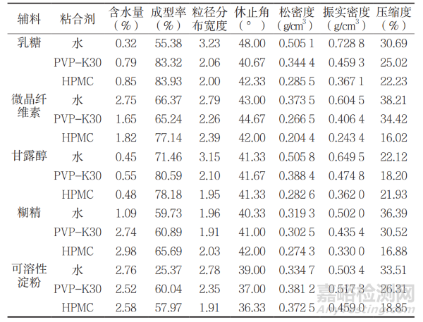 選用含水量、成型率、粒徑分布寬度、休止角、松密度、振實(shí)密度和壓縮度等 7 項(xiàng)指標(biāo)作為顆粒質(zhì)量的評(píng)價(jià)指標(biāo),能夠反映顆粒的流動(dòng)性與可壓性等物性質(zhì)量狀況。不同藥用輔料制備的顆粒物性質(zhì)量存在差異,乳糖和甘露醇以水為粘合劑制成的顆粒物性質(zhì)量較好,可溶性淀粉以 HPMC 為粘合劑制成的顆粒物性質(zhì)量較差。從制藥工藝角度考慮,由于顆粒質(zhì)量最終是體現(xiàn)在壓片質(zhì)量上,單一從顆粒指標(biāo)評(píng)價(jià)顆粒物性質(zhì)量難免存在局限性,后續(xù)研究應(yīng)結(jié)合壓片質(zhì)量指標(biāo)進(jìn)行綜合評(píng)價(jià)分析。