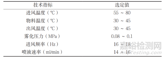 分別以糊精、甘露醇、微晶纖維素、乳糖和可溶性淀粉為單一制粒輔料,稱取重量均為 800 g,分別以純化水、5 % PVP-K30、5 %HPMC 作為粘合劑進(jìn)行流化床制粒,粘合劑用量均為700 ml,流化床操作技術(shù)參數(shù)見表1。成粒后繼續(xù)干燥,水分控制在 3 % 以下,過 20 目篩網(wǎng)整粒,取出備用。