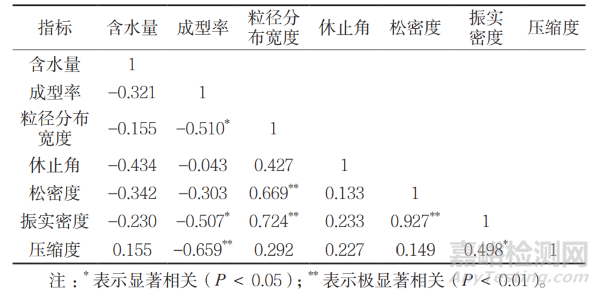 表 3 不同輔料制備的顆粒指標(biāo)相關(guān)性分析