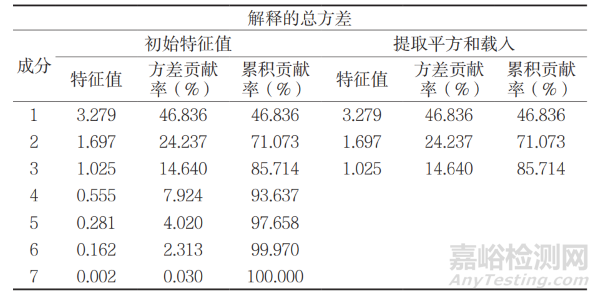 對(duì)不同輔料制成的 15 種顆粒 7 項(xiàng)物性指標(biāo)原始數(shù)值經(jīng)標(biāo)準(zhǔn)化處理后進(jìn)行主成分分析。由表4 可知,初始特征值大于 1 的主成分有三個(gè),且這三個(gè)主成分的方差貢獻(xiàn)率之和在 85 % 以上,即代表性較大,其余成分的初始特征值均趨于平坦且數(shù)值小于 1,即代表性較小。顆粒物性指標(biāo)前三個(gè)主成分的方差貢獻(xiàn)率分別為 46.645 %、24.237 %、14.640 %,累積方差貢獻(xiàn)率為 85.714%,也可看出三個(gè)主成分具有顯著代表性。