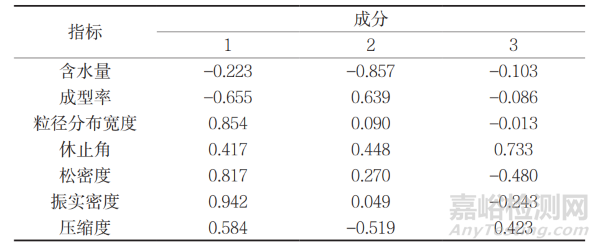 對(duì)第二主成分產(chǎn)生負(fù)向影響的物性指標(biāo)有含水量和壓縮度,對(duì)第二主成分負(fù)向影響最大的是含水量,載荷數(shù)為 -0.857。第二主成分正向影響中,以成型率的載荷數(shù)最大,載荷數(shù)為 0.639,其次是休止角。第二主成分大時(shí),成型率和休止角會(huì)相應(yīng)增大,而含水量和壓縮度這兩個(gè)指標(biāo)值會(huì)減小。第三主成分正向影響的指標(biāo)有休止角和壓縮度,以休止角的載荷數(shù)最大,載荷數(shù)為 0.733。對(duì)第三主成分產(chǎn)生負(fù)向影響的物性指標(biāo)中,負(fù)向影響最大的是松密度和振實(shí)密度,以松密度的載荷數(shù)最大,載荷數(shù)為 -0.480。第三主成分大時(shí),休止角和壓縮度會(huì)相應(yīng)增大,而松密度和振實(shí)密度這兩個(gè)指標(biāo)值會(huì)減小。