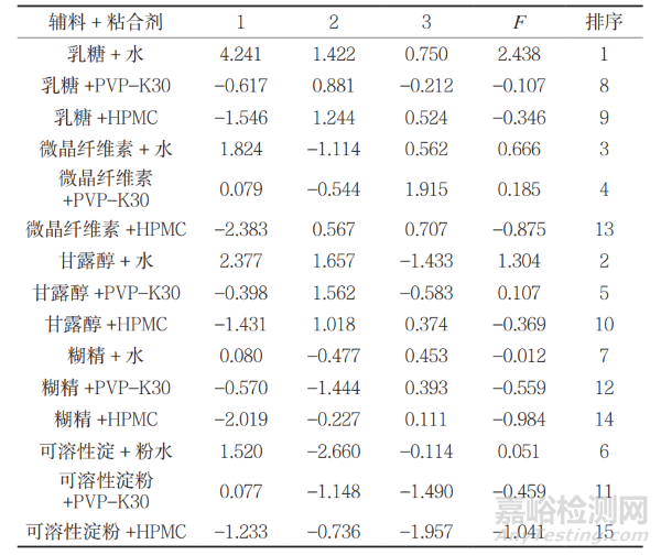 根據(jù)主成分綜合評(píng)價(jià)函數(shù)值可知不同輔料制備的 15 種顆粒的綜合得分和排序結(jié)果(表6) ,綜合得分在前二位的是乳糖 + 水制備的顆粒及甘露醇 + 水制備的顆粒。