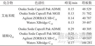 分別考察了Osaka Soda Capcell Pak ADME (250 mm×4.6 mm,5 μm)、Osaka Soda Capcell Pak MGⅡ(250 mm×4.6 mm,5 μm)、Agilent ZORBAX SB-C18 (250 mm×4.6 mm,5 μm)、Waters XBridge C18 (250 mm×4.6 mm,5 μm) 4種色譜柱對混合標準溶液(艾地苯醌和輔酶Q10質(zhì)量濃度均為100 mg/L)中2種目標物的分離效果,結(jié)果見表1。