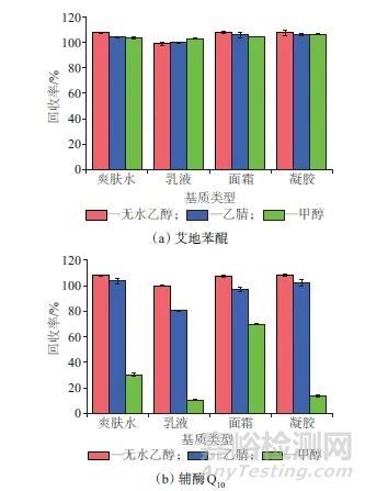 分別考察了無水乙醇、甲醇和乙腈3種溶劑對加標樣品溶液(艾地苯醌質(zhì)量濃度為25 mg/L、輔酶Q10質(zhì)量濃度為100 mg/L)中2種目標物的提取效果,結(jié)果如圖3所示。由圖3可以看出,3種溶劑對艾地