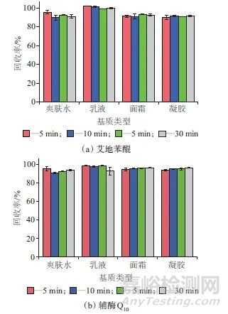 時間下,2種目標物的回收率差別不大,由于化妝品基質(zhì)復雜,超聲時間太短不能提取完全,同時為了節(jié)約時間,最終選擇超聲時間為20 min。