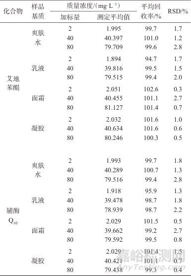 建立了高效液相色譜同時測定化妝品中艾地苯醌和輔酶Q10含量的分析方法。該方法樣品預處理簡單,易操作,具有較高的靈敏度和較好的準確性,可用于化妝品中艾地苯醌和輔酶Q10的同時測定。