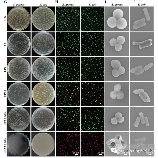 (1)研究者以S. aureus和E. coli為細(xì)菌模型,利用測(cè)試近紅外光響應(yīng)性抗菌凝膠的抑菌效果,明場(chǎng)圖及CLSM熒光圖表明負(fù)載PDA@Ag納米粒子的瓜爾膠水凝膠(CPA2)在近紅外光(NIR)作用下,能顯著增強(qiáng)凝膠的抗菌作用,單一負(fù)載PDA的水凝膠的光熱性能較弱,不足以殺死細(xì)菌。且熒光檢測(cè)結(jié)果與平板計(jì)數(shù)法結(jié)果具有相同的抗菌趨勢(shì);