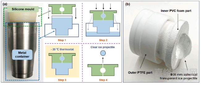 圖1 (a) 球形冰彈丸模具和制備過(guò)程;(b) 冰彈與彈托兩部分的組合