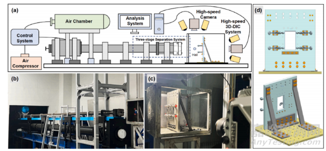 圖3 (a) 模擬冰雹高速?zèng)_擊測(cè)試系統(tǒng)示意圖;(b) 氣槍和分離系統(tǒng);(c) 夾具系統(tǒng)以及 (d) 夾具設(shè)備圖