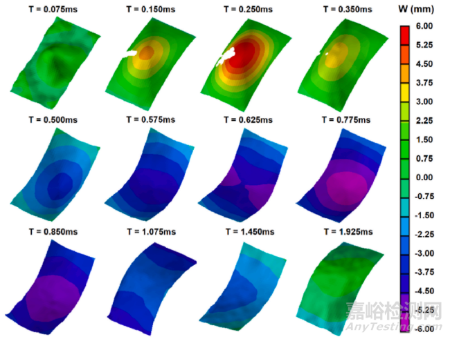 高速攝像捕捉了冰彈撞擊層合板的動(dòng)態(tài)過(guò)程,其失效分為四個(gè)階段:未損傷階段、前端開裂階段、逐步碎裂階段及流體擴(kuò)散階段。冰彈在接觸后50微秒內(nèi)完全穿透,隨后轉(zhuǎn)化為動(dòng)態(tài)流體狀。試件中心區(qū)域的峰值位移隨沖擊能量增加呈線性增長(zhǎng),并通過(guò)3D數(shù)字圖像相關(guān)技術(shù)量化了變形速率(Impact Deformation Rate,IDR)與位移分布。