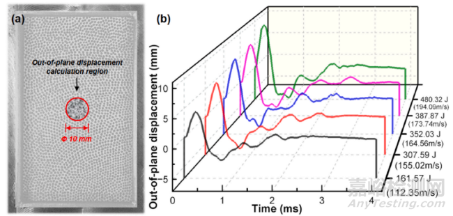 試件采用11層平紋編織碳/環(huán)氧樹脂層合板,尺寸為150毫米×100毫米,厚度4.4毫米。測(cè)試系統(tǒng)通過(guò)高速3D數(shù)字圖像相關(guān)(Digital Image Correlation, DIC)技術(shù)記錄試件全場(chǎng)應(yīng)變與位移分布,并結(jié)合超聲C掃描和顯微觀察分析損傷特征。