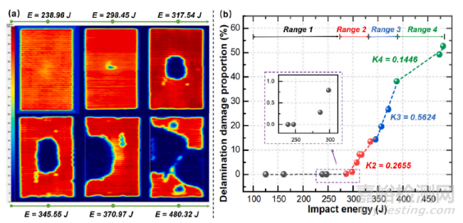 通過(guò)目視檢測(cè)、超聲C掃描和顯微觀察,研究人員將損傷模式分為五類:從無(wú)可見損傷到邊界貫穿分層。分層損傷比例(Delamination Damage Proportion, DDP)隨能量增加呈三階段變化,臨界能量閾值分別為247~286 J(分層起始)、307~311 J(背面纖維斷裂)及387~473 J(邊界貫穿分層)。