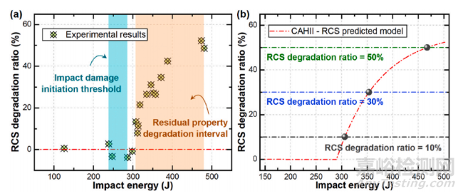 剩余壓縮強(qiáng)度(Residual Compressive Strength, RCS)隨沖擊能量呈指數(shù)下降,并提出預(yù)測(cè)模型。壓縮失效模式從局部剪切破壞過(guò)渡到全局分層屈曲,揭示了損傷演化與載荷分布的關(guān)聯(lián)性。