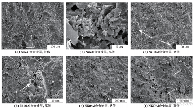 圖 6 不同鎳鋁合金涂層的斷口 SEM 形貌