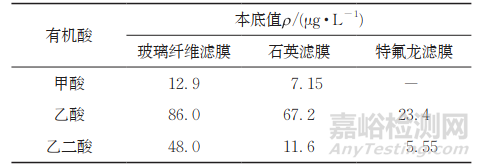 采集大氣顆粒物的濾膜材質(zhì)通常為特氟龍、石英、玻璃纖維等,用100mL水浸泡這3種材質(zhì)的空白濾膜,其中有機酸的本底值見表1。