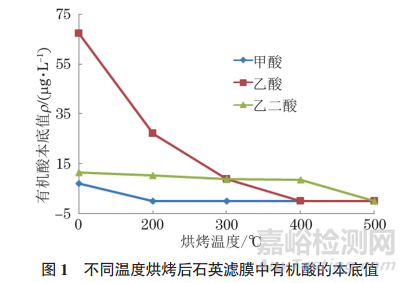 結(jié)合2.1節(jié)數(shù)據(jù)可知,石英濾膜存在一定的有機酸本底干擾??紤]到甲酸、乙酸沸點分別為100.8,118℃,乙二酸在150~160℃內(nèi)升華,試驗以200℃為起始烘烤溫度,比較了分別以0,200,300,400,500℃烘烤石英濾膜2h后石英濾膜中有機酸本底值的變化,結(jié)果見圖1。