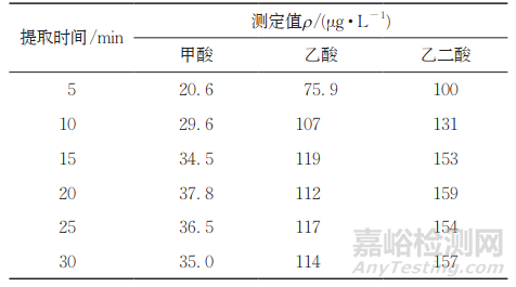 提取時間過短,目標(biāo)物可能未被充分提取,準(zhǔn)確度降低;提取時間過長,揮發(fā)損失量和時間成本增加,試驗效率降低。采用石英濾膜采集3張現(xiàn)場平行樣品,并將每張樣品膜均勻切割成兩份,按照試驗方法測定,考察了提取時間分別為5,10,15,20,25,30min時樣品膜中3種有機酸含量的變化,結(jié)果見表2。