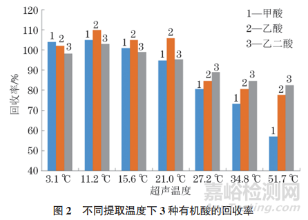 結(jié)果顯示:當(dāng)提取溫度在21.0℃及以下時,3種有機酸的回收率均在90.0%~110%內(nèi),回收效果良好;提取溫度繼續(xù)上升,3種有機酸均有不同程度的損失;當(dāng)超聲溫度達(dá)到51.7℃時,甲酸損失了近一半,乙酸和乙二酸的回收率僅有77.6%,82.5%,說明提取過程中需將溫度控制在21℃及以下,以盡可能減少有機酸的揮發(fā)損失。