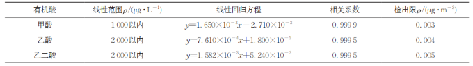 按照儀器工作條件測定混合標(biāo)準(zhǔn)溶液系列,以各有機酸的質(zhì)量濃度為橫坐標(biāo),對應(yīng)的峰面積為縱坐標(biāo)繪制標(biāo)準(zhǔn)曲線,所得的線性參數(shù)見表3。