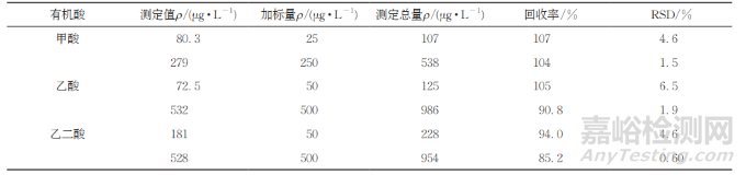 結(jié)果顯示,甲酸、乙酸、乙二酸的回收率為85.2%~107%,測定值的RSD均不大于6.5%,說明方法的準(zhǔn)確度和精密度較好。
