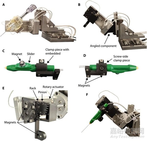 圖 2. 為實現視網膜下注射對機器人所做的改進。(A)(47)中描述的原始機器人。(B)45 度角的部件,用于改善經玻璃體途徑的運動學條件。(C)用于可伸縮套管滑塊的磁性連接件,以及嵌入了磁鐵的磁性器械夾持器夾片部件。(D)磁性器械夾持器的部件,通過旋入嵌入磁鐵的夾片將器械固定到位。(E)用于磁性固定視網膜下注射套管的 3D 打印部件。齒輪齒條機構使機器人的旋轉致動器能夠驅動可伸縮套管滑塊。(F)完全組裝好的改進版機器人。