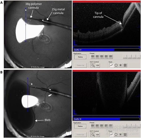 圖 4. 視網膜下注射過程中拍攝的紅外反射(左)和光學相干斷層掃描(OCT,右)圖像。(A)在即將啟動注射泵之前,套管完全壓入視網膜。(B)在紅外反射成像和光學相干斷層掃描成像下,可以看到液泡開始形成并擴張。光學相干斷層掃描的穿透深度不足以捕捉到完全形成的液泡的完整高度。由于鏡面反射偽像,光學相干斷層掃描圖像中液泡的輪廓看起來是上下顛倒的。請注意,紅外反射圖像中的亮區(qū)僅僅是反射光。