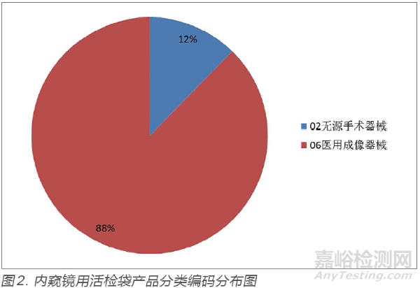 根據(jù)《醫(yī)療器械分類目錄》,該產(chǎn)品按二類醫(yī)療器械進行管理,分類編碼為06-16-06。根據(jù)已批準注冊的產(chǎn)品注冊證編號,結合《醫(yī)療器械注冊與備案管理辦法》中關于產(chǎn)品注冊證編號規(guī)則的描述,在梳理的138 個已批準注冊產(chǎn)品中,發(fā)現(xiàn)對于活檢袋產(chǎn)品在《醫(yī)療器械分類目錄》中的分類歸屬認識還存在差異,如圖2 所示,其中有17 個產(chǎn)品被歸入到《醫(yī)療器械分類目錄》的02 無源手術器械子目錄下,占批準產(chǎn)品的12.3%,其余產(chǎn)品均被歸入到《醫(yī)療器械分類目錄》的06 醫(yī)用成像器械子目錄下,占批準產(chǎn)品的87.7%。