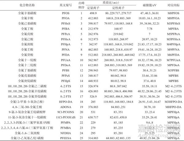 表2 25種全氟/多氟化合物質(zhì)譜參數(shù)