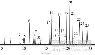1—全氟辛基磺酸; 2—全氟辛酸; 3—全氟己基磺酸; 4—全氟丁酸;5—全氟戊酸; 6—全氟己酸; 7—全氟庚酸; 8—全氟壬酸; 9—全氟癸酸; 10—全氟十一烷酸; 11—全氟十二烷酸; 12—全氟丁基磺酸;13—全氟戊基磺酸; 14—全氟庚烷磺酸; 15—1H,1H,2H,2H-全氟己二磺酸; 16—1H,1H,2H,2H-全氟辛烷磺酸; 17—1H,1H,2H,2H-全氟癸烷磺酸; 18—全氟(2-甲基-3-氧雜己酸); 19—4,8-二氧-3H-全氟壬酸; 20—9-氯-3-氧雜全氟壬烷磺酸鉀; 21—11-氯-3-氧雜全氟十一烷磺酸; 22—2,2,3,3-四氟-3-(三氟甲氧基)丙酸;23—2,2,3,3,4,4-六氟-4-(三氟甲氧基)丁酸; 24—全氟-3,6-二氧庚酸; 25—全氟(2-乙氧基乙烷)磺酸圖1 25種PFASs的總離子流色譜圖