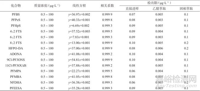 在1.2儀器工作條件下,測定25種PFASs系列混合標準工作溶液,以PFASs色譜峰面積與內(nèi)標物峰面積之比為縱坐標,標準溶液中目標物質(zhì)量濃度與內(nèi)標物質(zhì)量濃度之比為橫坐標,繪制標準工作曲線,計算線性方程和相關(guān)系數(shù)。根據(jù)HJ 168—2020《環(huán)境監(jiān)測分析方法標準制訂技術(shù)導(dǎo)則》,每種樣品處理方法分別測定7個低濃度加標樣品,計算測定結(jié)果的標準偏差s,按3.14s計算方法檢出限。25種PFASs質(zhì)量濃度線性范圍、線性方程、相關(guān)系數(shù)和檢出限見表4。