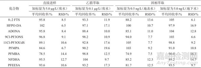 選擇氟化工園區(qū)廢水、地表水和地下水,分別添加0.1、5.0 µg/L和0.5、5.0 ng/L 4個質(zhì)量濃度水平的目標物,每個質(zhì)量濃度水平平行測定6次,計算回收率和測定結(jié)果的相對標準偏差(RSD),結(jié)果見表5。