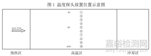 用于校準熱分布溫度差和溫度波動度的溫度探頭均勻放置在垂直于輸送帶運行方向上,放置于輸送帶兩側(cè)的溫度探頭須貼近邊緣放置。并圖中 A1、A5、A10 是與①、⑤、⑩位置溫度探頭共同測量同一相對位置溫度波動度的。放置時前后兩支溫度探頭要在輸送帶運行方向?qū)R。具體放置可參考圖 1。