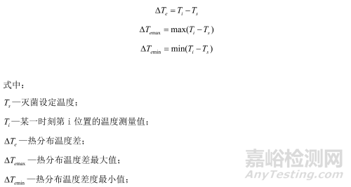 將某個測量熱分布溫度差溫度探頭記錄的進入高溫區(qū)結果數(shù)據(jù)與滅菌設定溫度差值記為熱分布溫度差。取該組數(shù)據(jù)的最大值和最小值記為熱分布溫度差最大值和最小值。熱分布溫度差應小于±10℃。