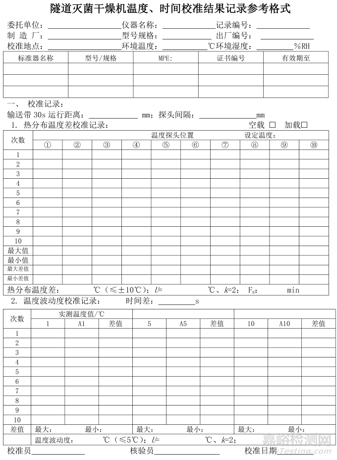 隧道滅菌干燥機溫度、時間校準結果記錄參考格式