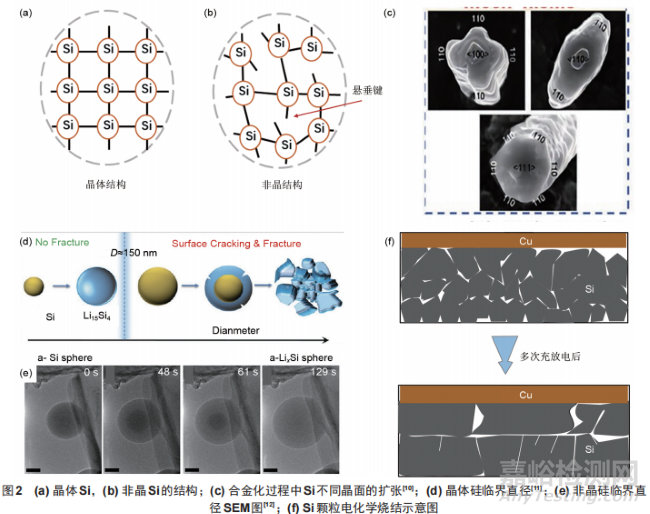 根據(jù)材料晶體結(jié)構(gòu)的差異,硅基材料可以分為兩大類:晶體硅(c-Si)和無定形硅(a-Si)。c-Si具備有序排列的晶格結(jié)構(gòu)和明顯的晶粒各向異性,相比之下,a-Si內(nèi)部由于存在大量懸垂鍵,導(dǎo)致Si原子偏離軌道,形成各向同性[圖2(a)、(b)]。此外,懸垂鍵的存在也使得a-Si合金化反應(yīng)需要克服的勢壘下降,更有利于合金化反應(yīng)的進(jìn)行。由于晶體結(jié)構(gòu)的不同,c-Si和aSi的鋰化過程表現(xiàn)出差異。在c-Si形成a-LixSi(x<3.75)的鋰化過程中,不同晶面上相邊界移動速度不同,導(dǎo)致膨脹速率不均勻,在膨脹速率較快的方向上產(chǎn)生應(yīng)力集中,超出材料承受極限后可能導(dǎo)致結(jié)構(gòu)破裂,相比之下,a-Si鋰化速度各向同性,使得應(yīng)力釋放更均勻,避免了應(yīng)力在某個方向上集中[圖2(c)]。這種應(yīng)力釋放機(jī)制將a-Si的臨界直徑拓寬至870nm,顯著大于c-Si的150nm