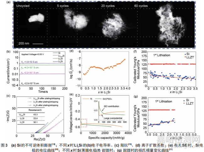 有觀點(diǎn)認(rèn)為硅在嵌鋰、脫鋰過程中從晶體到非晶結(jié)構(gòu)相變引起的局部機(jī)械應(yīng)力是造成容量快速衰減的主要因素。Iwasa等研究了納米晶體硅電極首次鋰化為Li0.6Si、Li1.08Si、Li2.06Si和Li3.75Si相的楊氏模量,發(fā)現(xiàn)當(dāng)x≤0.375時,LixSi合金的楊氏模量與Li的含量呈線性關(guān)系,而在0.52<x<0.67范圍內(nèi),LixSi合金的楊氏模量保持為恒量。Zeng等在室溫下使用原位高壓同步加速器X 射線衍射(XRD)實(shí)驗(yàn)測量了亞穩(wěn)態(tài)多晶Li15Si4相的體積模量,發(fā)現(xiàn)晶體Li12Si7和Li7Si3的體積模量和Li與Si的比例表現(xiàn)出非線性行為。非原位表征結(jié)果受到樣品轉(zhuǎn)移過程中的電壓松弛以及樣品不均勻性的干擾。近來,Putra等采用雙峰原子力顯微鏡,以楊氏模量為力學(xué)映射指標(biāo),測得了非晶Si薄膜電極在固態(tài)電池中首次嵌鋰和脫鋰過程中的實(shí)時形貌和模量變化。在鋰化初期(x=0~0.37),Si薄膜電極的模量急劇下降,隨著LixSi中x繼續(xù)增加,楊氏模量緩慢下降[圖3(f)];而在脫鋰過程中,LixSi電極的模量與x呈現(xiàn)近似線性關(guān)系[圖3(g)]。需要更多的測試手段來直接獲取連續(xù)嵌鋰、脫鋰過程中LixSi中局部機(jī)械應(yīng)力變化,尤其是兩相區(qū)域中的應(yīng)力變化,這對于減輕硅基固態(tài)電池機(jī)械衰退和電極故障方面至關(guān)重要。