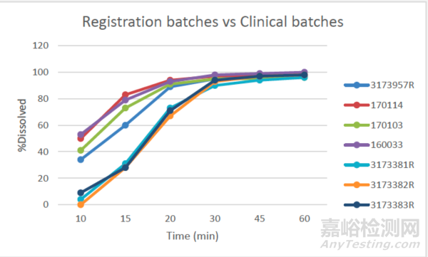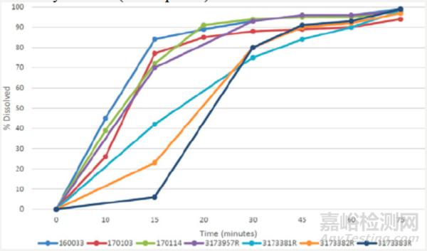 批間也觀察到早期取樣時間點的高變異性。特別是,三個注冊批次(批次3173381R、3173382R、3173383R)的溶出曲線與四批臨床3期樣品(批次160033、170103、170114和3173957R)的溶出曲線明顯不同,如圖7所示。