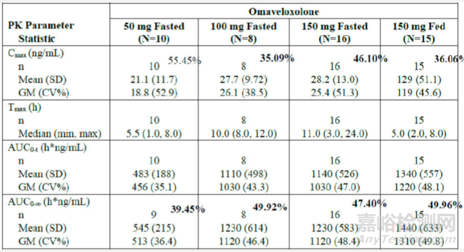 如表12所示,PK參數(shù)的變異性超過35%。食物對Cmax和Tmax向左移動(從1小時到5小時)有顯著影響,這表明食物通過增加其滲透性顯著促進了omaveloxolone的吸收。食物效應研究結果證實,omaveloxolone的滲透性低。