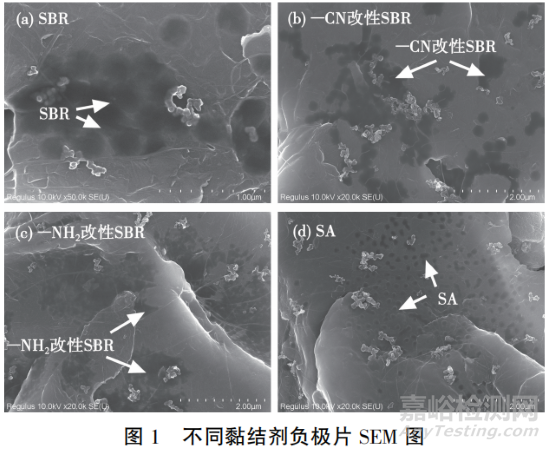 不同負(fù)極黏結(jié)劑極片的SEM圖見圖1。從圖1可知,SBR類黏結(jié)劑在極片內(nèi)的分布較集中,呈現(xiàn)出多顆粒團(tuán)聚的狀態(tài),顆?;ハ嗾尺B并呈片狀分布,如圖1(a)、圖1(b)和圖1(c)中箭頭標(biāo)識所示。SA 類黏結(jié)劑在極片內(nèi)的分布較為分散,顆粒之間沒有粘連,并以單顆粒形式分布在表面,如圖1(d)深色區(qū)域所示。
