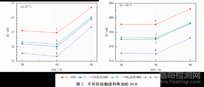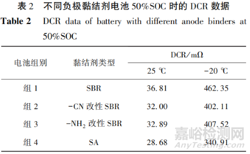 50%SOC時的DCR數(shù)據(jù)見表2。從表2可知:在25℃下,組4電池的DCR比組1電池的下降22.08%。在-20℃下,組4電池的DCR比組1電池的下降26.26%。組4電池之所以表現(xiàn)出更小的DCR,是因為SA黏結(jié)劑在負(fù)極顆粒表面的分布更分散,且未發(fā)生大量黏結(jié)劑顆粒團(tuán)聚的問題。